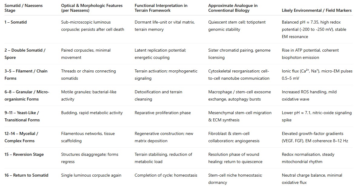 A note on “stem cells”. My current theory is that what modern science calls stem cells are actually born of the 16-stage pleomorphic somatid cycle described by Gaston Naessens.